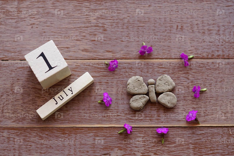 Первый день июля, красочный фон с календарем, цветами и глиняной бабочкой