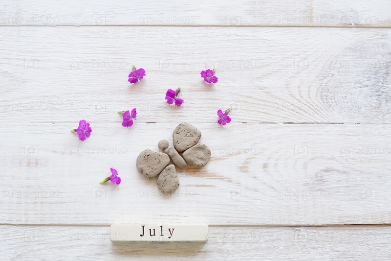 Первый день июля, красочный фон с календарем, цветами и глиняной бабочкой