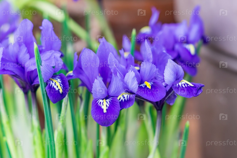Голубые горшечные ирисы крупным планом, цветы в весеннем саду