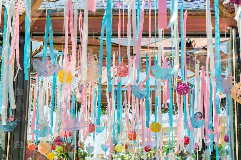 Свадебное или праздничное украшение. Висячие ленты, ротанговые шарики и птицы на открытом воздухе