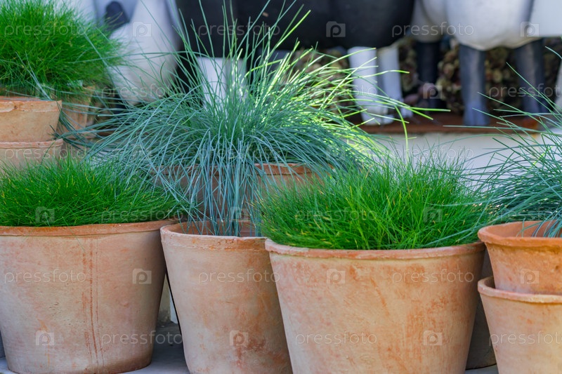 Зеленая трава в глиняных горшках на открытом воздухе. украшение сада