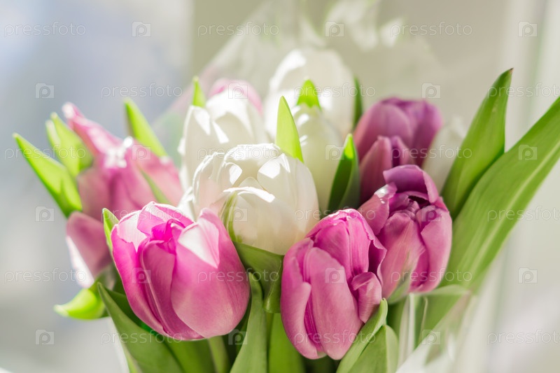 Белые и фиолетовые цветущие тюльпаны. цветочный фон