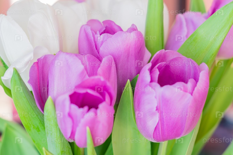 Белые и фиолетовые цветущие тюльпаны. цветочный фон