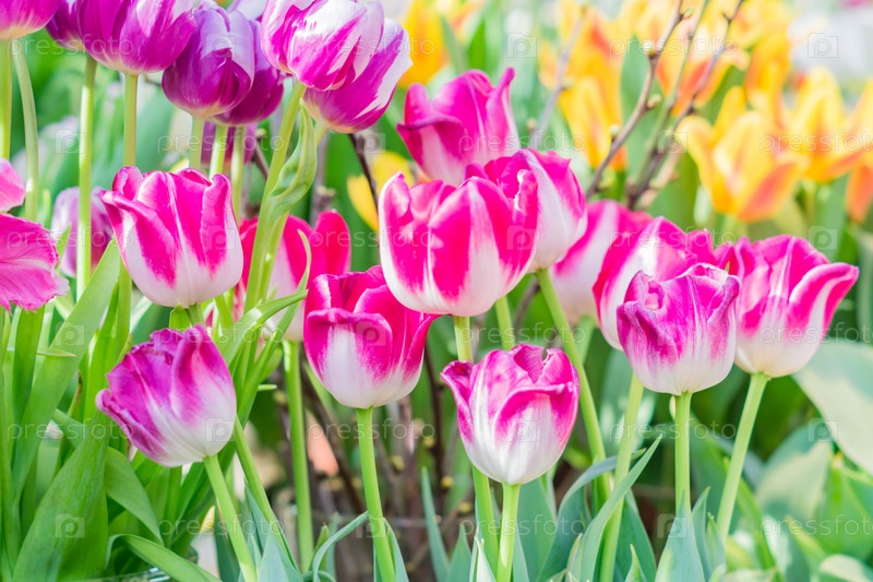 Поле цветущих разноцветных тюльпанов, весенние цветы в саду