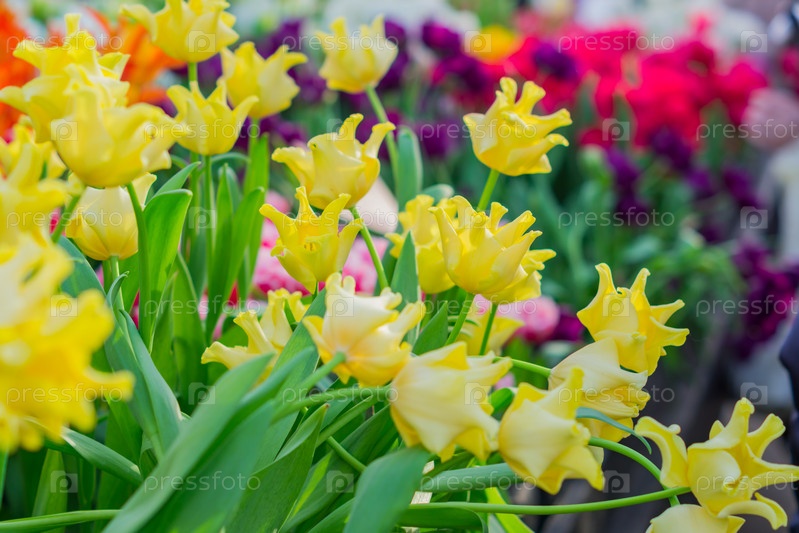Поле цветущих красочных тюльпанов, весенние цветы в саду