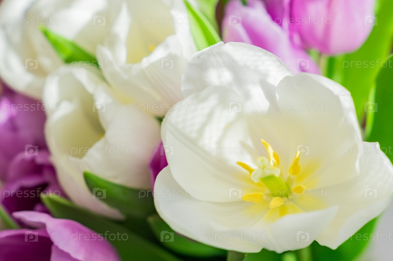 Белые и фиолетовые цветущие тюльпаны. цветочный фон