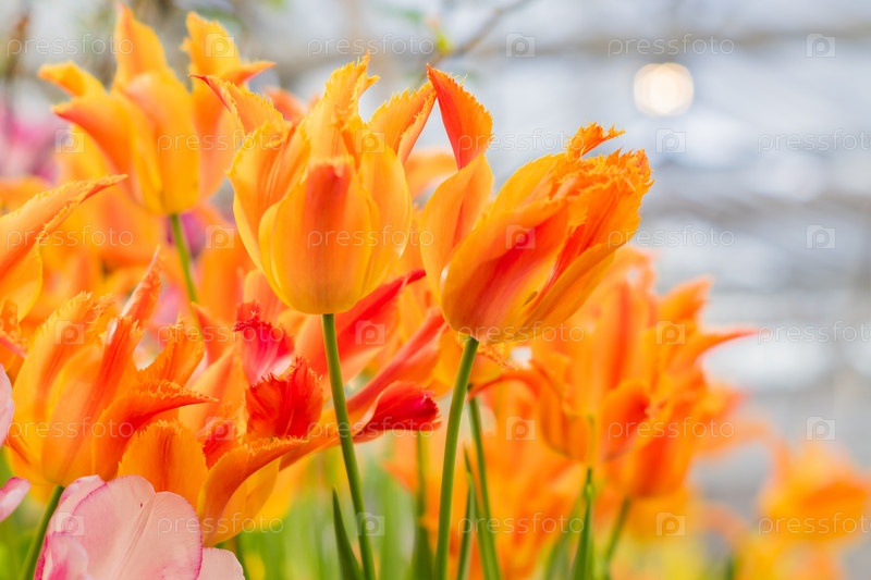 Поле цветущих разноцветных тюльпанов, весенние цветы в саду