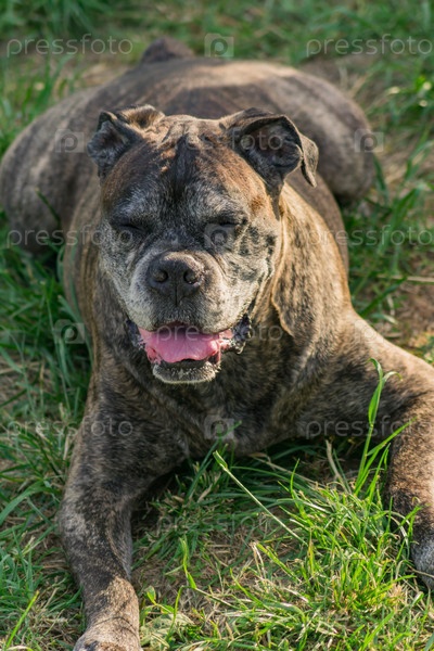 Старый немецкий боксер отдыхает на траве на открытом воздухе