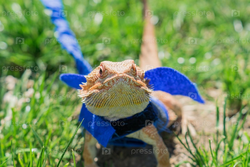 Крупный план бородатого дракона (Pogona vitticeps) на зеленой траве.Экзотическое домашнее животное
