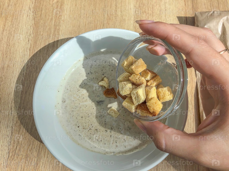 Женская рука наливает гренки в грибной суп-пюре. бизнес-ланч в кафе