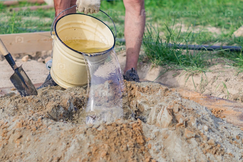 Строитель сливает воду в смесь песка и цемента. Изготовление цемента на строительной площадке,
