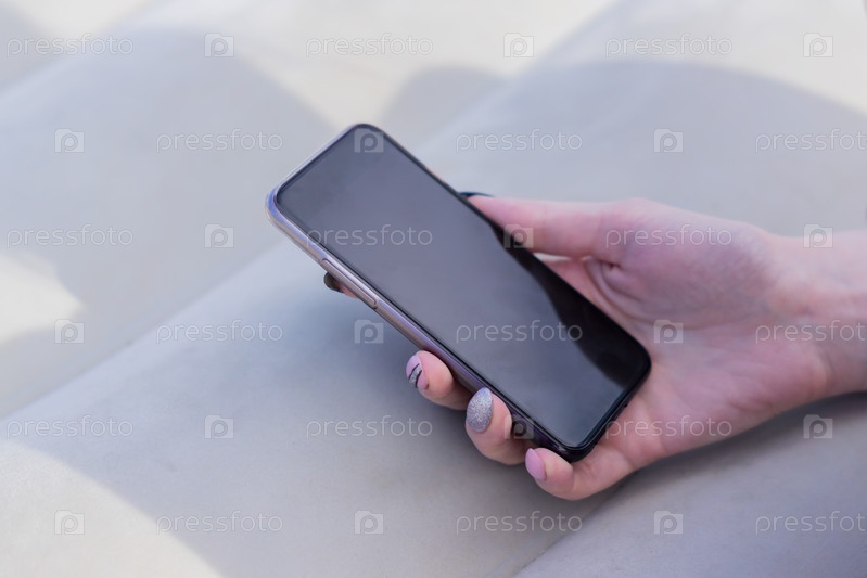 Женская рука с маникюром держит черный смартфон