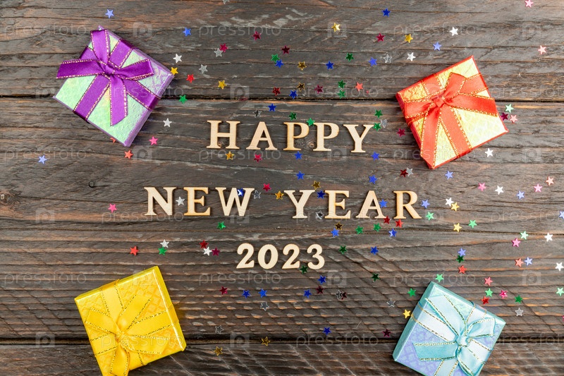 С Новым годом деревянные буквы на праздничном фоне с блестками, звездами, разноцветными подарочными коробками. Привет, открытка