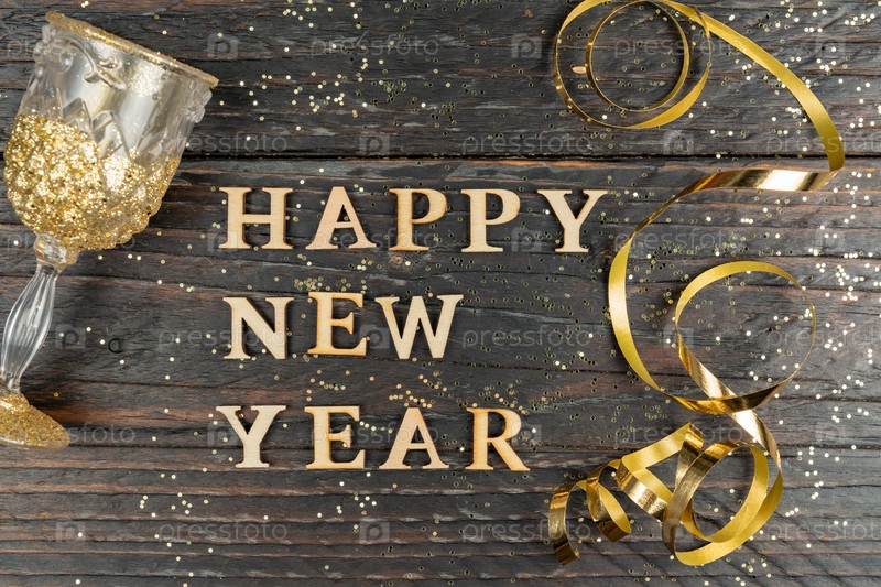 Открытка с новым годом. Бокал шампанского и серпантин золотого цвета на деревянном столе с разбросанными конфетти