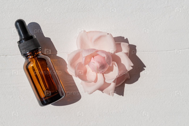 Бутылка из темного стекла с коллагеном или гиалуроновой кислотой на деревянном фоне. Место для текста. Косметика, сыворотка для ухода за кожей, нежный уход
