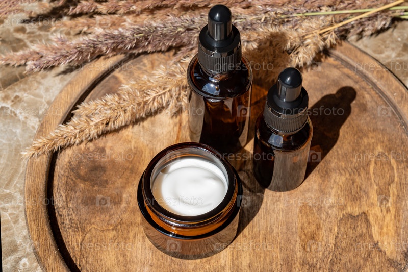 Набор косметических флаконов из янтарного стекла на деревянном подносе. флакон-капельница и баночка с кремом. Дизайн упаковки косметических средств по уходу за кожей для повседневной жизни