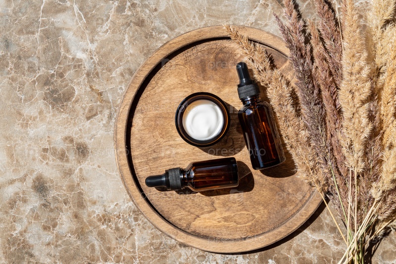 Антивозрастная коллагеновая сыворотка для лица в бутылке из темного стекла и лицевой крем на деревянной подносе на фоне msrble с копировальным пространством