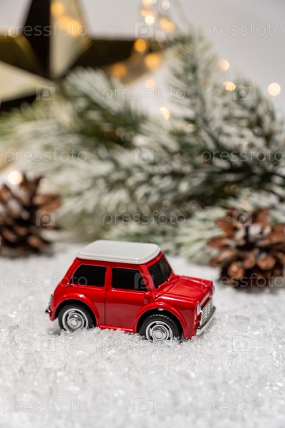 Миниатюрная красная игрушечная машинка с елями. Фон зимних праздников. Рождественская концепция, праздничная доставка. Рождественские украшения и огни боке