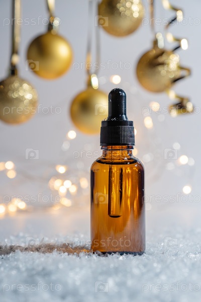 Рождественская косметика. Пипетка-капельница с косметическим маслом для лица на фоне сверкающих золотых безделушек. Концепция подарка по уходу за лицом и телом