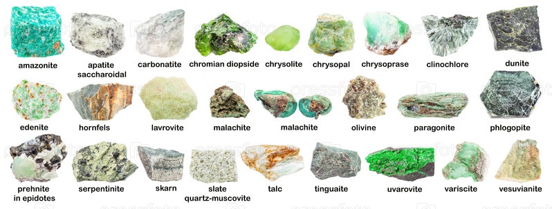 Набор различных зеленых неполированных минералов с именем
