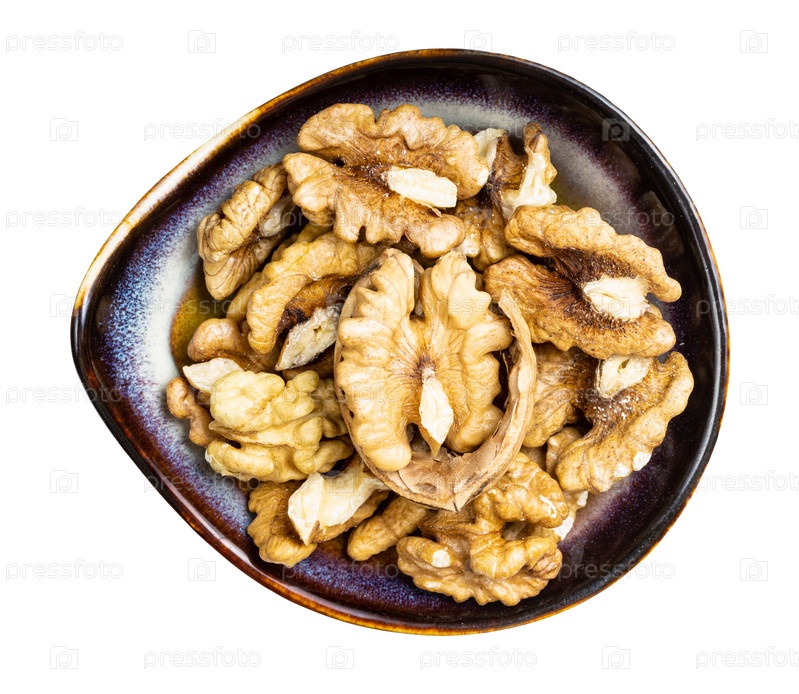 Вид сверху на очищенные грецкие орехи в миске изолированы