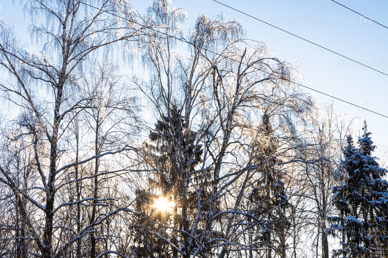 Заходящее солнце светит сквозь замерзшие ветки деревьев
