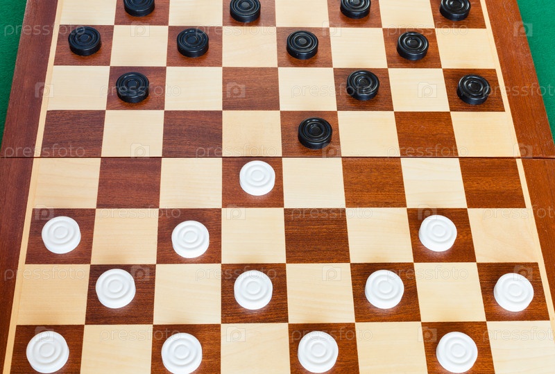 Деревянная доска с шашками на зеленом столе