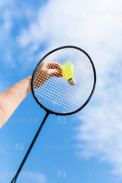 Рука ударяет по волану ракеткой для бадминтона