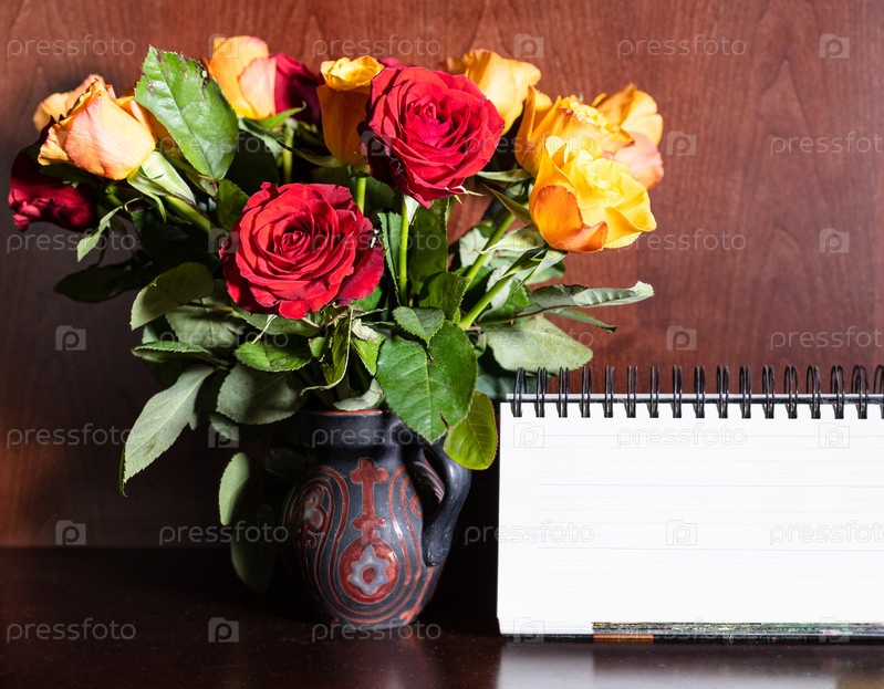 Пустой настольный календарь и свежие красные и желтые розы