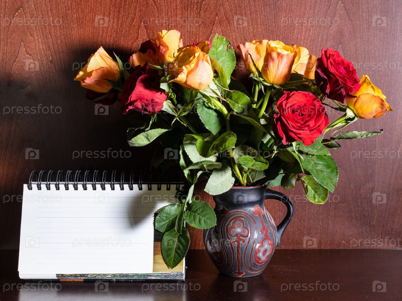 Розы в керамическом кувшине и пустой календарь темно-коричневого цвета