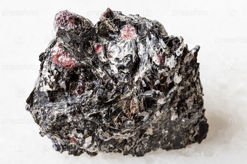 Необработанные красные кристаллы граната в биотитовой породе на белом