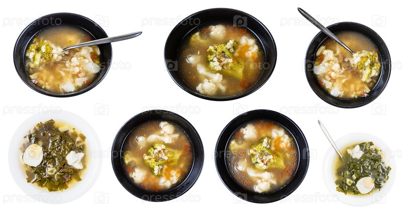 Набор овощных супов, изолированных на белом