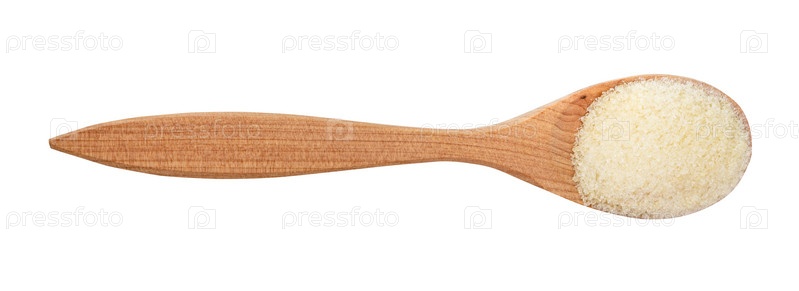 Вид сверху кристаллический желатин из говядины в деревянной ложке