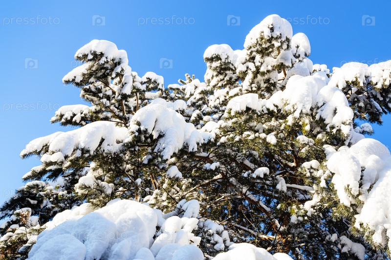 Заснеженные зеленые ветки сосны зимой