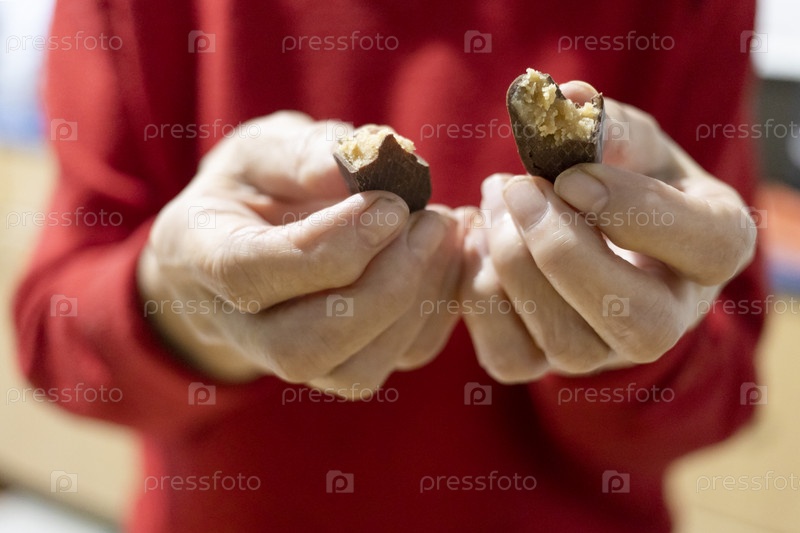 Руки пожилой женщины держат сломанную шоколадную конфету