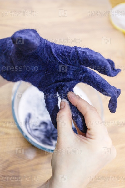 Мастер регулирует размер пальца в валяной перчатке