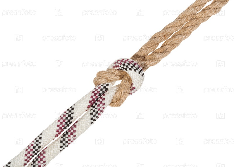 Квадратный узел, соединяющий две веревки, изолированные на белом