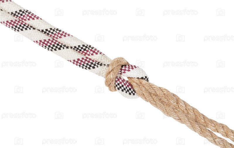 Двойной узел, соединяющий две веревки, изолированные на белом