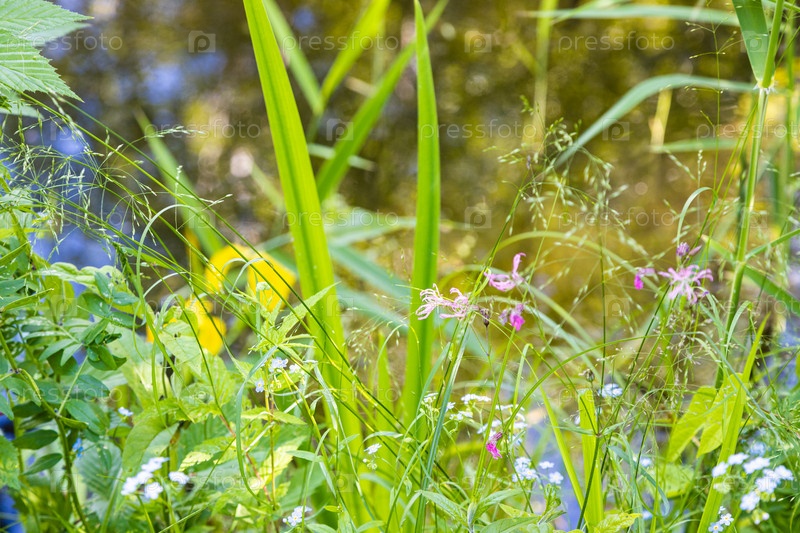 Пышная листва крупным планом на берегу лесного пруда