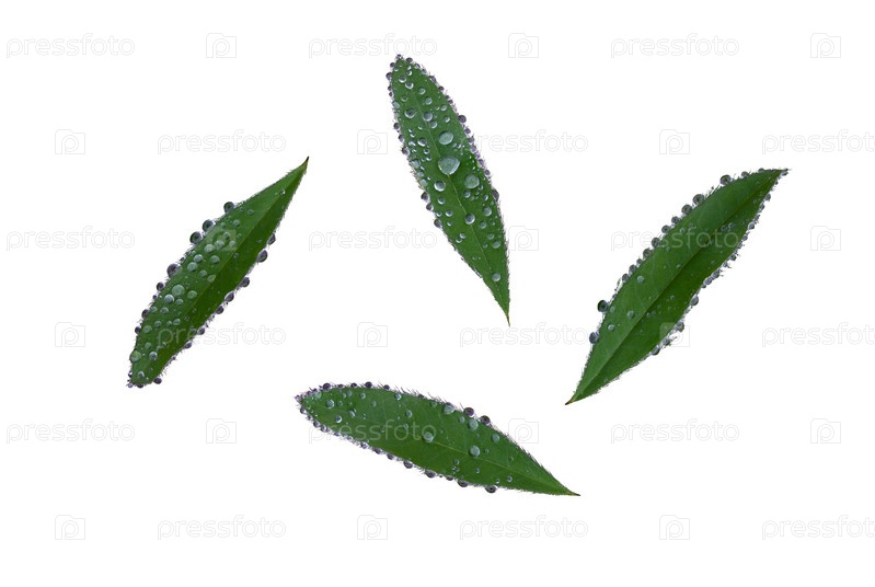 Листья люпина по отдельности, изолированы на белом фоне. Фотография после дождя, капли дождя на листьях, роса