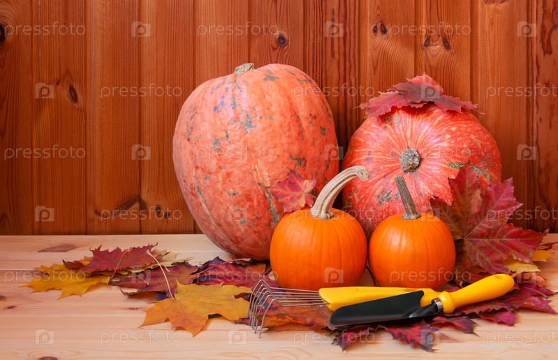 Оранжевые тыквы, садовые инструменты и кленовые листья на деревянном фоне