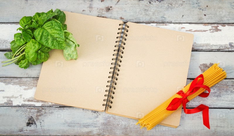 Открытая тетрадь, сырые спагетти и зеленый базилик на старом деревянном столе