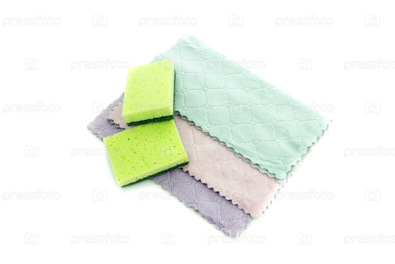 Чистящие тряпки и мочалки на белом фоне