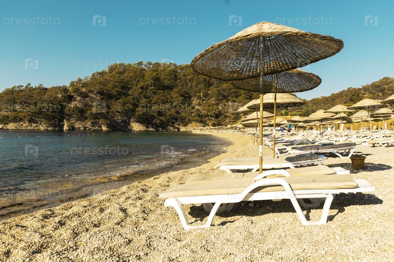 Красивый пейзаж с пляжем и морем. Концепция летнего отдыха