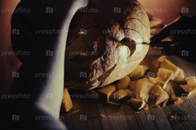 Процесс вырезания тыквы на Хэллоуин ножом на столе