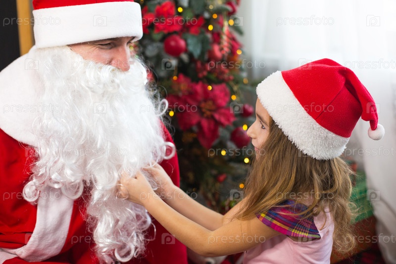 Маленькая девочка в шляпе Санты на коленях у Санты возле елки в рождественском декоре. Показывает коробку с подарком, мягкую игрушку, трогает бороду и смеется. Новый год, русский дедушка Мороз