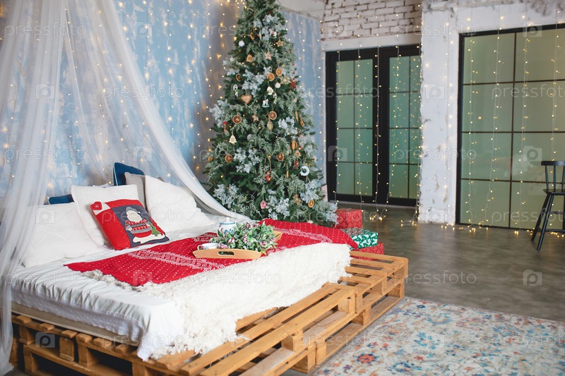 Новогодний декор в спальню в стиле лофт. Кровать с балдахином из деревянных поддонов с белым постельным бельем и красными одеялами и подушками. Еловые и золотые гирлянды, освещенное окно. Новый год