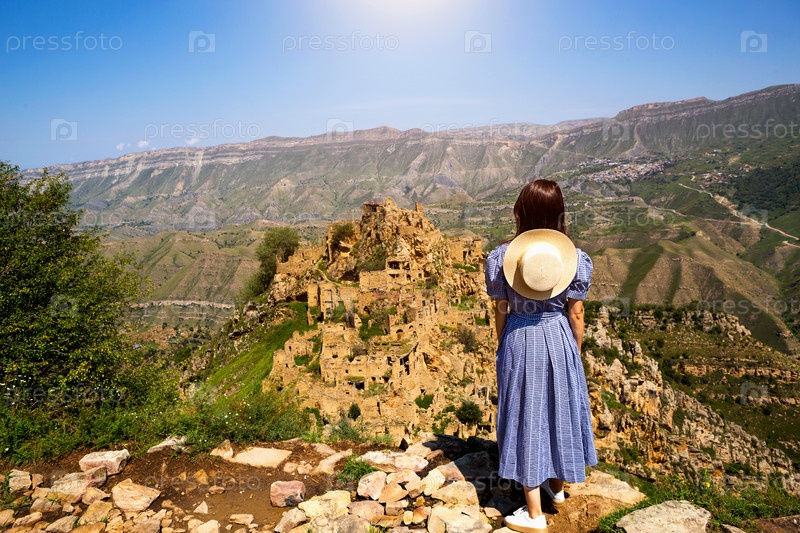 Туристка высоко в горах Дагестана любуется захватывающим панорамным видом на природу и древний заброшенный город Гамсутль. Кавказские горы, туристическая достопримечательность, руины, поход