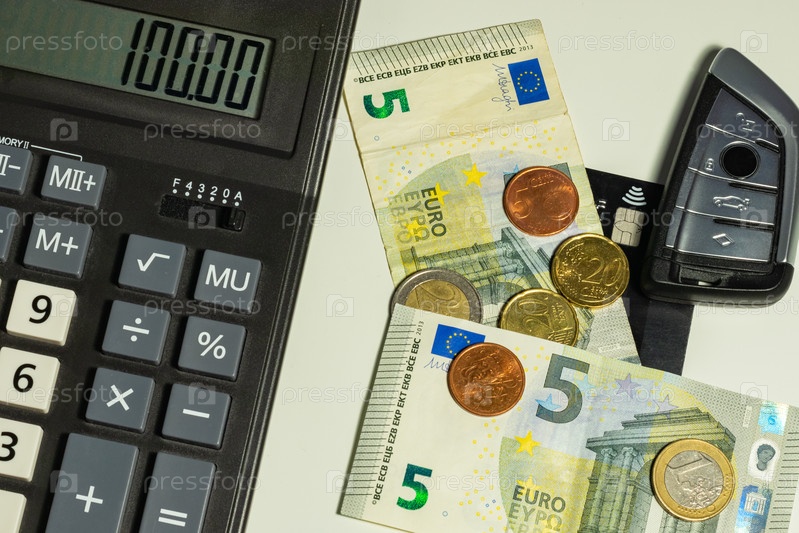 Крупный план калькулятора на фоне европейской валюты 5 евро. бизнес-концепция