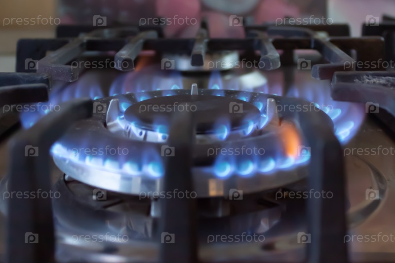 Голубое пламя газа горит на кухонной газовой плите. крупным планом